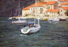 Montenegro. Boats At The Peer Of The City Of Perast - oil, canvas