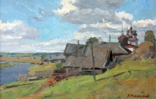 A Small Village At The Oka River - oil, fireboard