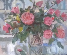 Flowers At The Window. Roses Are Leaving The Garden - oil, canvas