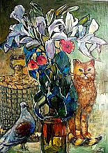 Lilies, Cat And Pigeon - oil, canvas